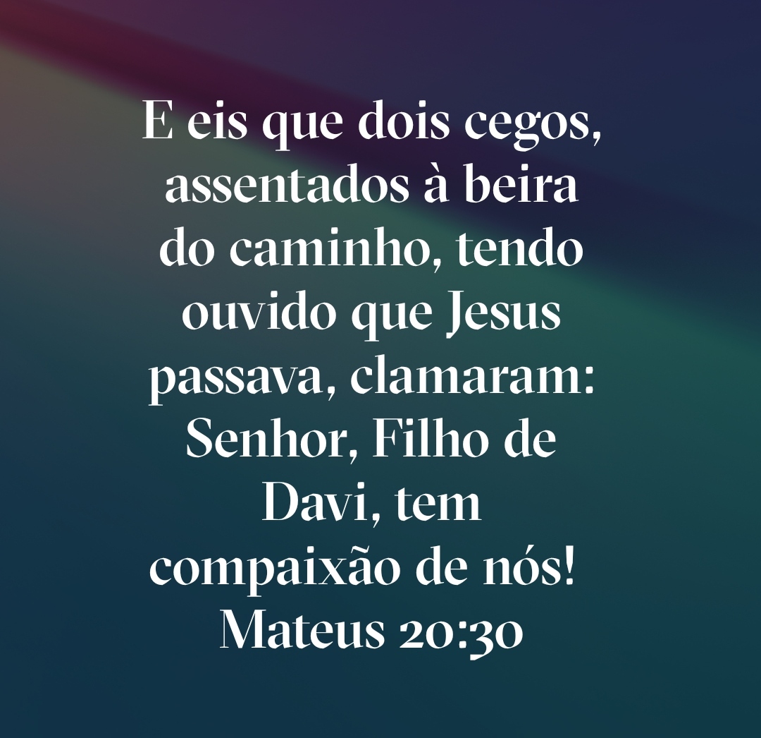 E eis que dois cegos, assentados à beira do caminho, tendo ouvido que Jesus passava, clamaram: Senhor, Filho de Davi, tem compaixão de nós!