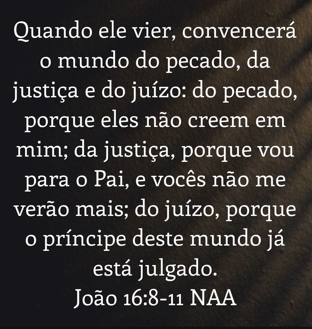 Quando ele vier, convencerá o mundo do pecado, da justiça e do juízo: do pecado, porque eles não creem em mim; da justiça, porque vou para o Pai, e vocês não me verão mais; do juízo, porque o príncipe deste mundo já está julgado. João 16:8-11 NAA