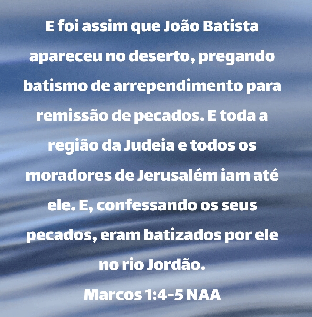 E foi assim que João Batista apareceu no deserto, pregando batismo de arrependimento para remissão de pecados. E toda a região da Judeia e todos os moradores de Jerusalém iam até ele. E, confessando os seus pecados, eram batizados por ele no rio Jordão. Marcos 1:4-5 NAA
