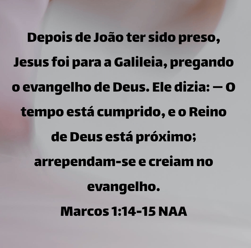 Depois de João ter sido preso, Jesus foi para a Galileia, pregando o evangelho de Deus. Ele dizia: — O tempo está cumprido, e o Reino de Deus está próximo; arrependam-se e creiam no evangelho. Marcos 1:14-15 NAA
