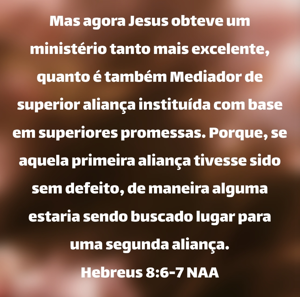 Mas agora Jesus obteve um ministério tanto mais excelente, quanto é também Mediador de superior aliança instituída com base em superiores promessas. Porque, se aquela primeira aliança tivesse sido sem defeito, de maneira alguma estaria sendo buscado lugar para uma segunda aliança. Hebreus 8:6-7 NAA