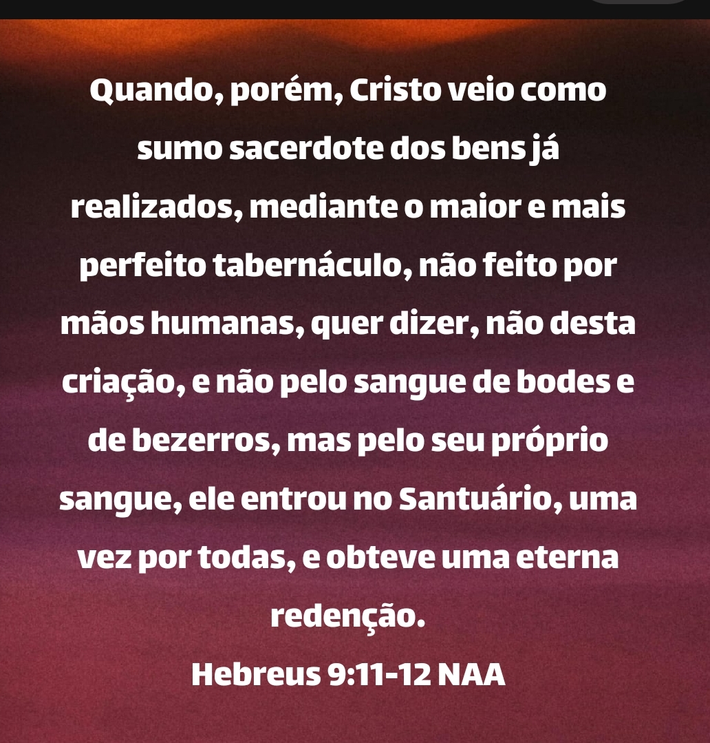 Quando, porém, Cristo veio como sumo sacerdote dos bens já realizados, mediante o maior e mais perfeito tabernáculo, não feito por mãos humanas, quer dizer, não desta criação, e não pelo sangue de bodes e de bezerros, mas pelo seu próprio sangue, ele entrou no Santuário, uma vez por todas, e obteve uma eterna redenção. Hebreus 9:11-12 NAA