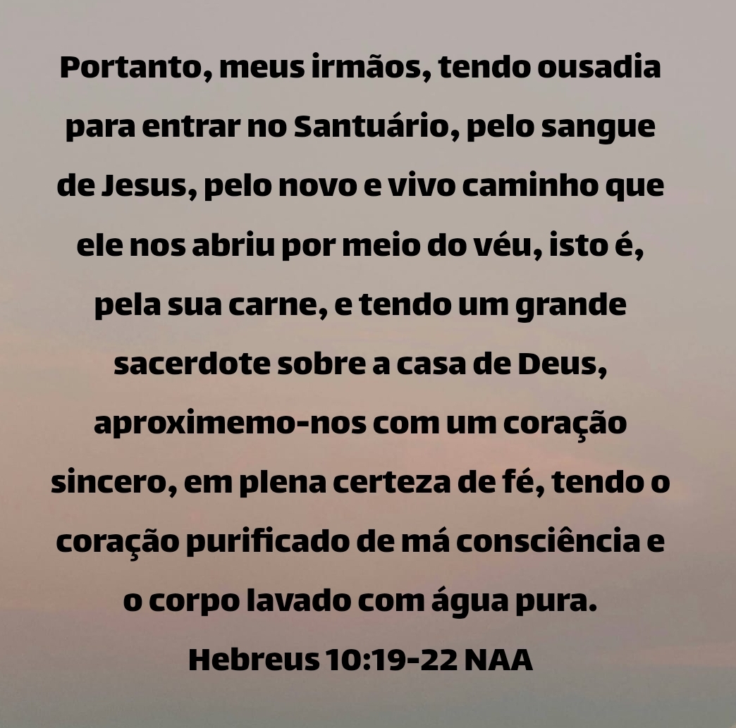 Portanto, meus irmãos, tendo ousadia para entrar no Santuário, pelo sangue de Jesus, pelo novo e vivo caminho que ele nos abriu por meio do véu, isto é, pela sua carne, e tendo um grande sacerdote sobre a casa de Deus, aproximemo-nos com um coração sincero, em plena certeza de fé, tendo o coração purificado de má consciência e o corpo lavado com água pura. Hebreus 10:19-22 NAA