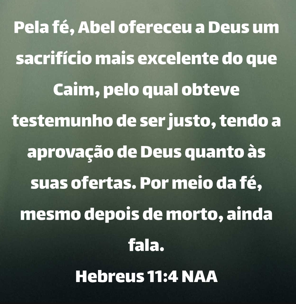 Pela fé, Abel ofereceu a Deus um sacrifício mais excelente do que Caim, pelo qual obteve testemunho de ser justo, tendo a aprovação de Deus quanto às suas ofertas. Por meio da fé, mesmo depois de morto, ainda fala. Hebreus 11:4 NAA