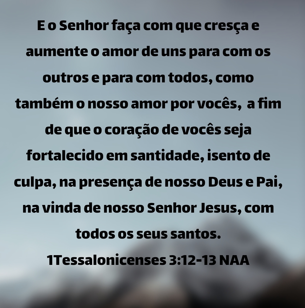 E o Senhor faça com que cresça e aumente o amor de uns para com os outros e para com todos, como também o nosso amor por vocês, a fim de que o coração de vocês seja fortalecido em santidade, isento de culpa, na presença de nosso Deus e Pai, na vinda de nosso Senhor Jesus, com todos os seus santos. 1Tessalonicenses 3:12-13 NAA