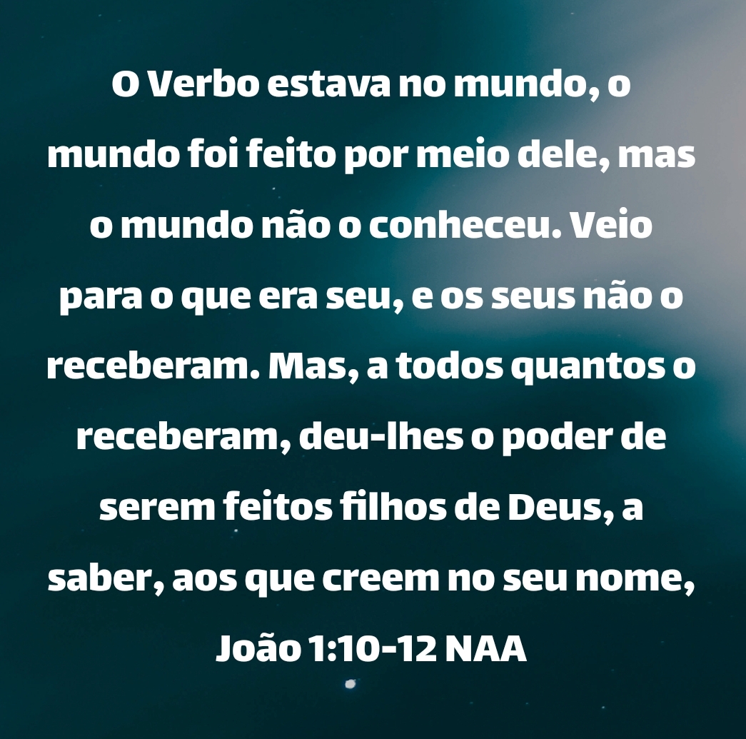 O Verbo estava no mundo, o mundo foi feito por meio dele, mas o mundo não o conheceu. Veio para o que era seu, e os seus não o receberam. Mas, a todos quantos o receberam, deu-lhes o poder de serem feitos filhos de Deus, a saber, aos que creem no seu nome, João 1:10-12 NAA