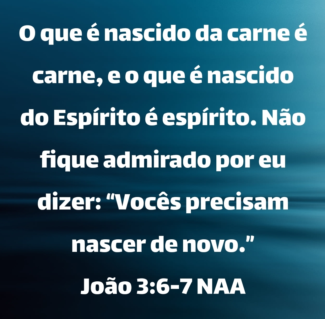 O que é nascido da carne é carne, e o que é nascido do Espírito é espírito. Não fique admirado por eu dizer: “Vocês precisam nascer de novo.” João 3:6-7 NAA