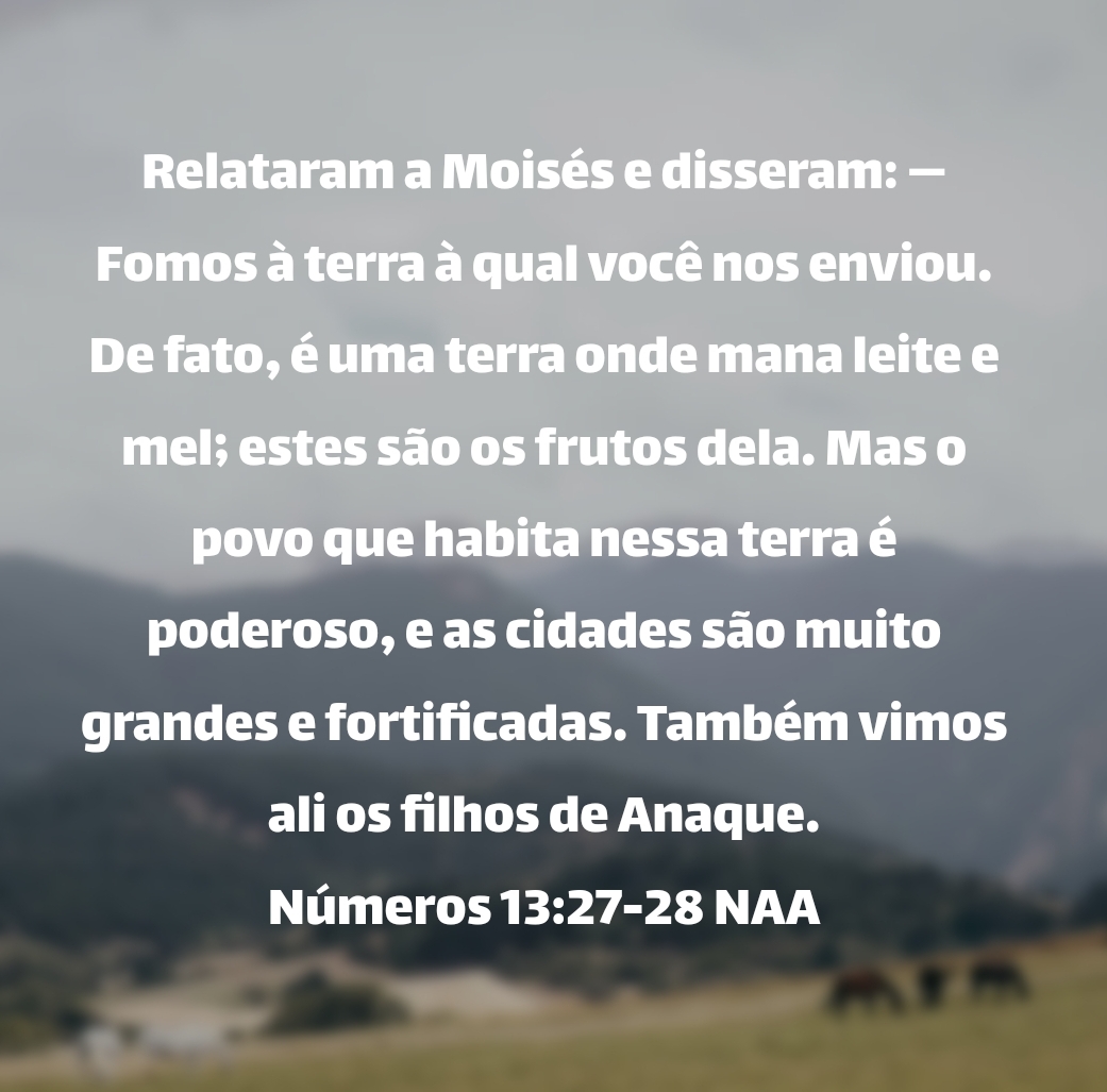 Relataram a Moisés e disseram: — Fomos à terra à qual você nos enviou. De fato, é uma terra onde mana leite e mel; estes são os frutos dela. Mas o povo que habita nessa terra é poderoso, e as cidades são muito grandes e fortificadas. Também vimos ali os filhos de Anaque. Números 13:27-28 NAA