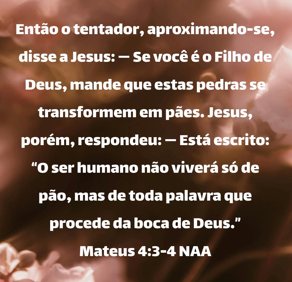 Então o tentador, aproximando-se, disse a Jesus: — Se você é o Filho de Deus, mande que estas pedras se transformem em pães. Jesus, porém, respondeu: — Está escrito: “O ser humano não viverá só de pão, mas de toda palavra que procede da boca de Deus.” Mateus 4:3-4 NAA