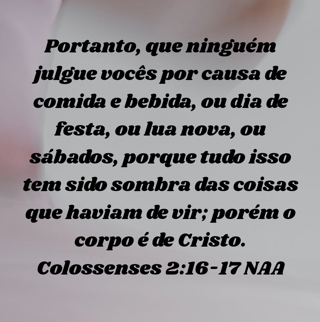 Portanto, que ninguém julgue vocês por causa de comida e bebida, ou dia de festa, ou lua nova, ou sábados, porque tudo isso tem sido sombra das coisas que haviam de vir; porém o corpo é de Cristo. Colossenses 2:16-17 NAA