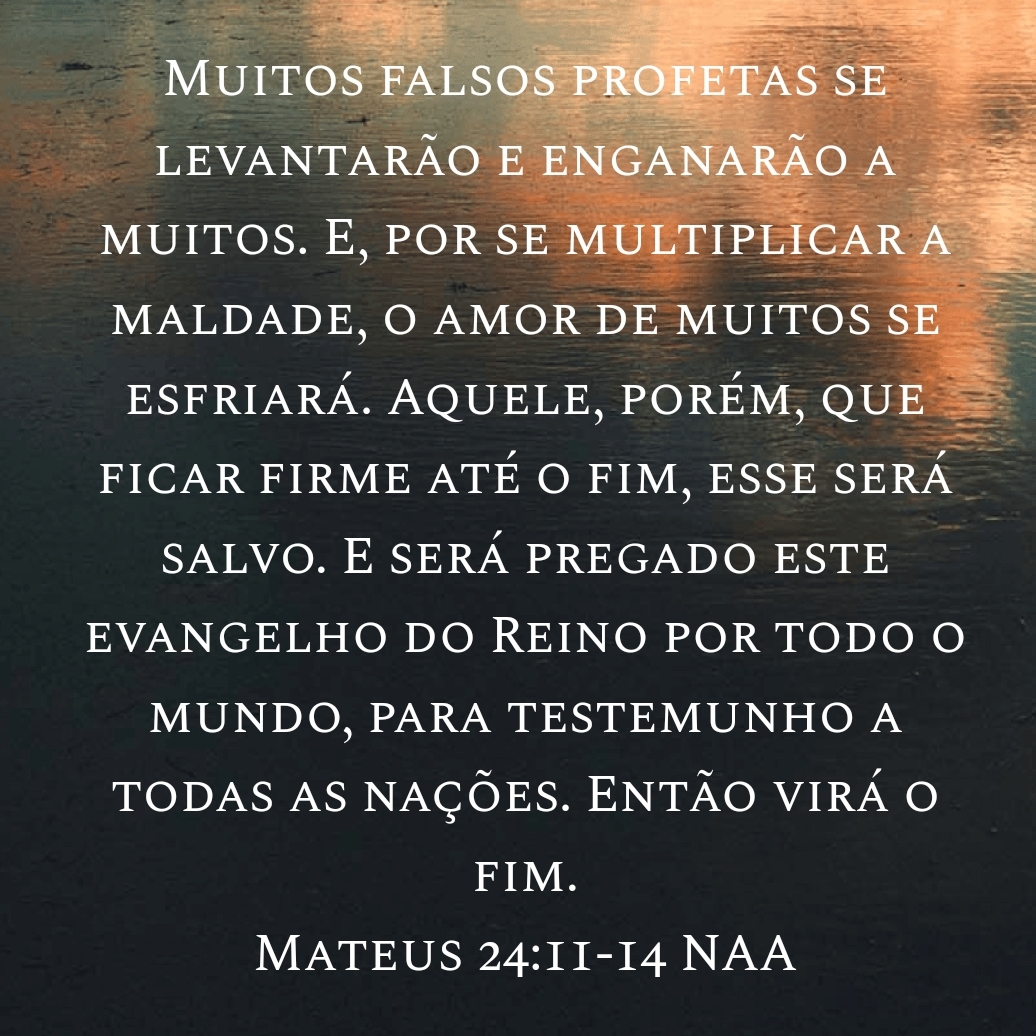 Muitos falsos profetas se levantarão e enganarão a muitos. E, por se multiplicar a maldade, o amor de muitos se esfriará. Aquele, porém, que ficar firme até o fim, esse será salvo. E será pregado este evangelho do Reino por todo o mundo, para testemunho a todas as nações. Então virá o fim. Mateus 24:11-14 NAA