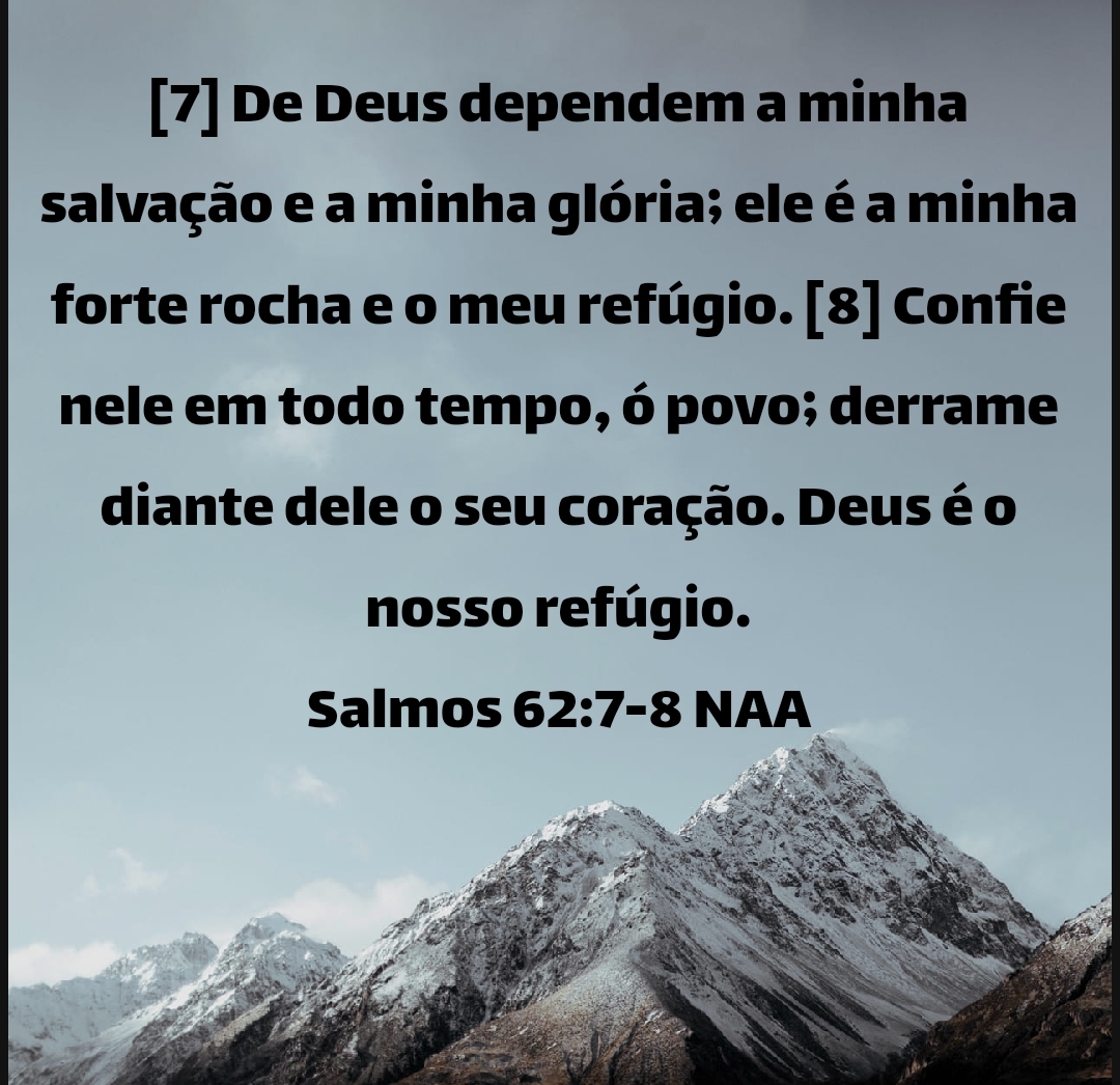 [7] De Deus dependem a minha salvação e a minha glória; ele é a minha forte rocha e o meu refúgio. [8] Confie nele em todo tempo, ó povo; derrame diante dele o seu coração. Deus é o nosso refúgio.
