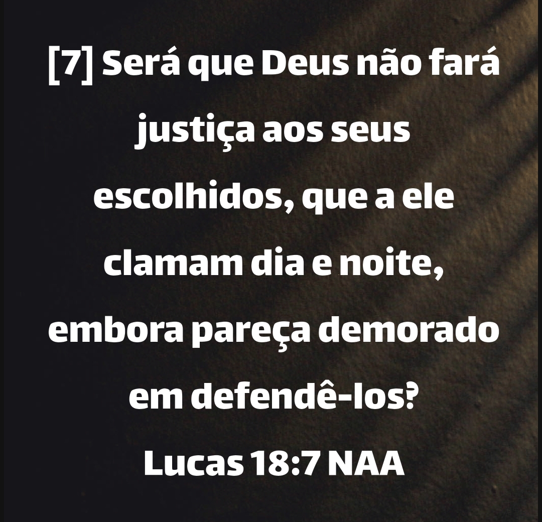 [7] Será que Deus não fará justiça aos seus escolhidos, que a ele clamam dia e noite, embora pareça demorado em defendê-los?