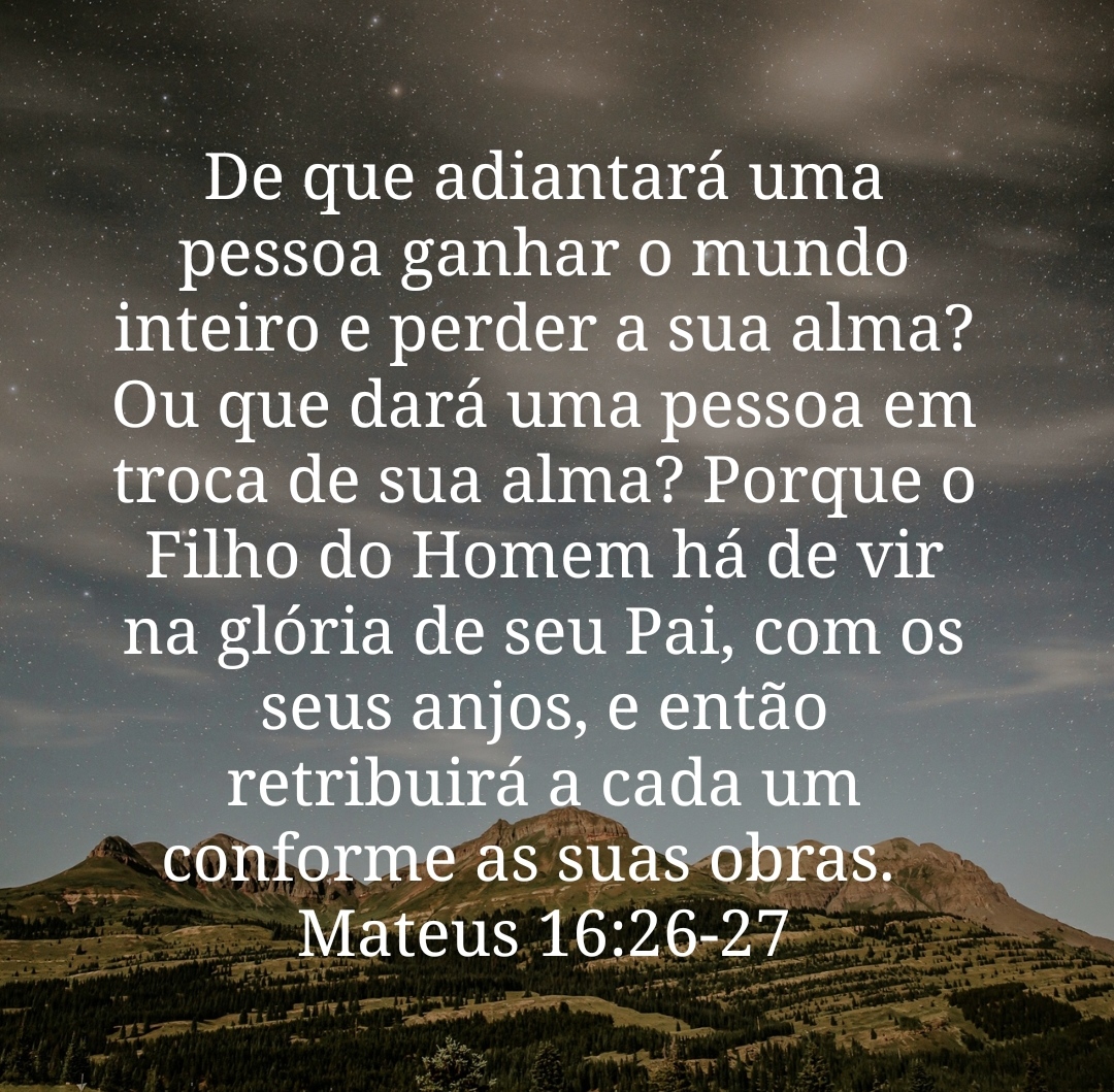 De que adianta uma pessoa ganhar o mundo inteiro e perder a sua alma? Que daria uma pessoa em troca de sua alma? Marcos 8:36-37 NAA