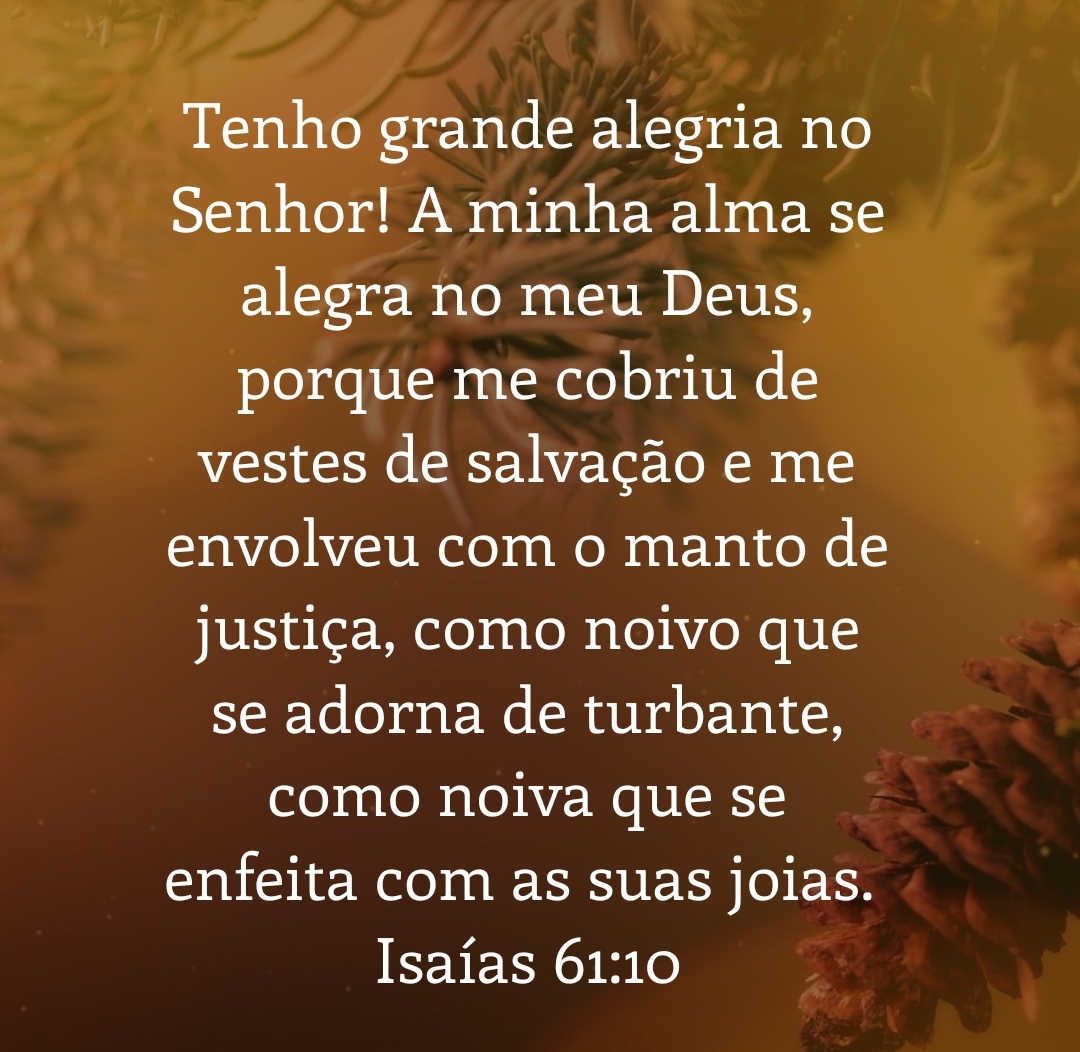 Tenho grande alegria no Senhor! A minha alma se alegra no meu Deus, porque me cobriu de vestes de salvação e me envolveu com o manto de justiça, como noivo que se adorna de turbante, como noiva que se enfeita com as suas joias.