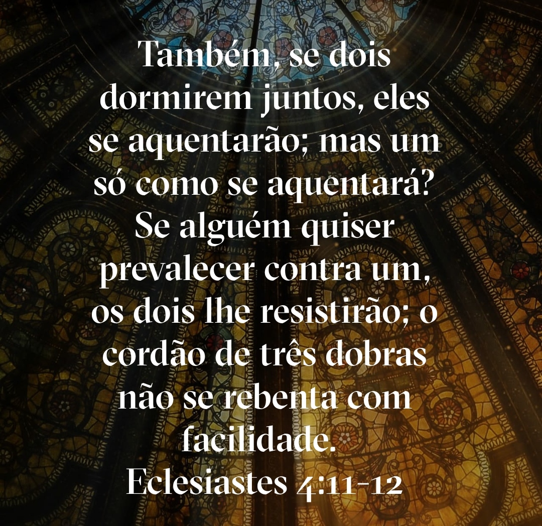 Também, se dois dormirem juntos, eles se aquentarão; mas um só como se aquentará? Se alguém quiser prevalecer contra um, os dois lhe resistirão; o cordão de três dobras não se rebenta com facilidade.