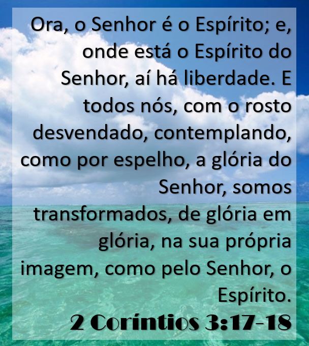 Ora, o Senhor é o Espírito; e, onde está o Espírito do Senhor, aí há liberdade. E todos nós, com o rosto desvendado, contemplando, como por espelho, a glória do Senhor, somos transformados, de glória em glória, na sua própria imagem, como pelo Senhor, o Espírito.