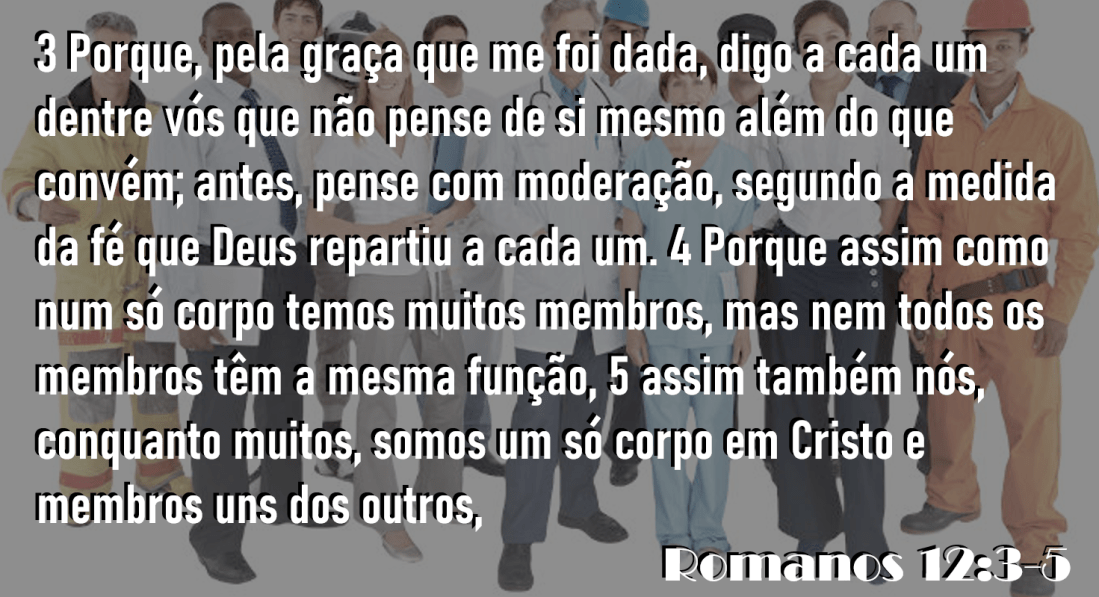 3 Porque, pela graça que me foi dada, digo a cada um dentre vós que não pense de si mesmo além do que convém; antes, pense com moderação, segundo a medida da fé que Deus repartiu a cada um. 4 Porque assim como num só corpo temos muitos membros, mas nem todos os membros têm a mesma função, 5 assim também nós, conquanto muitos, somos um só corpo em Cristo e membros uns dos outros,