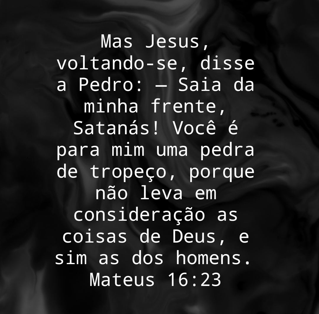 Mas Jesus, voltando-se, disse a Pedro: — Saia da minha frente, Satanás! Você é para mim uma pedra de tropeço, porque não leva em consideração as coisas de Deus, e sim as dos homens.