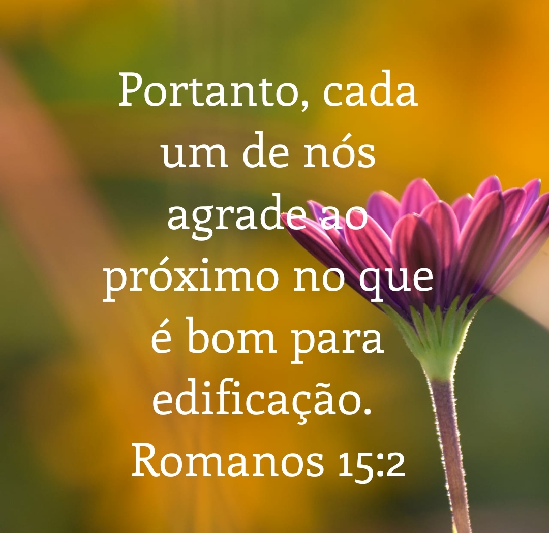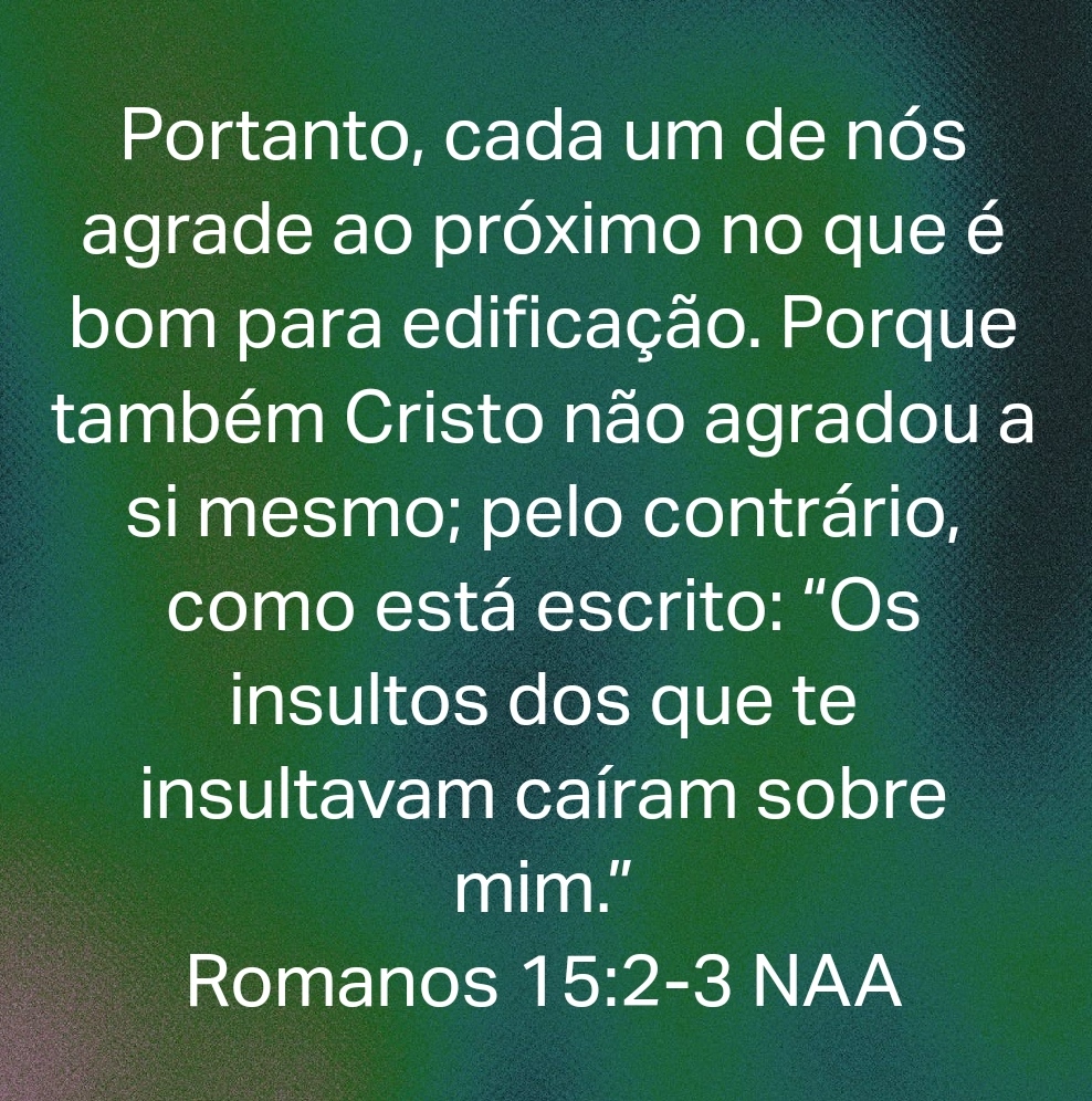 ‭‭Portanto, cada um de nós agrade ao próximo no que é bom para edificação. Porque também Cristo não agradou a si mesmo; pelo contrário, como está escrito: “Os insultos dos que te insultavam caíram sobre mim.” Romanos‬ ‭15:2‭-‬3‬ ‭NAA‬‬