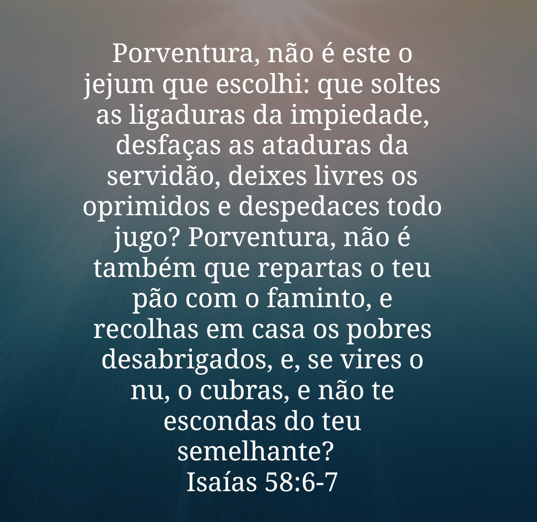 Porventura, não é este o jejum que escolhi: que soltes as ligaduras da impiedade, desfaças as ataduras da servidão, deixes livres os oprimidos e despedaces todo jugo? Porventura, não é também que repartas o teu pão com o faminto, e recolhas em casa os pobres desabrigados, e, se vires o nu, o cubras, e não te escondas do teu semelhante?