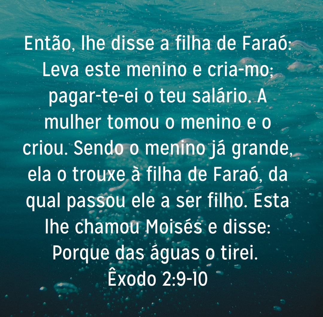 Então, lhe disse a filha de Faraó: Leva este menino e cria-mo; pagar-te-ei o teu salário. A mulher tomou o menino e o criou. Sendo o menino já grande, ela o trouxe à filha de Faraó, da qual passou ele a ser filho. Esta lhe chamou Moisés e disse: Porque das águas o tirei.