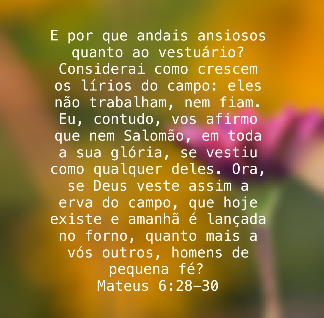E por que andais ansiosos quanto ao vestuário? Considerai como crescem os lírios do campo: eles não trabalham, nem fiam. Eu, contudo, vos afirmo que nem Salomão, em toda a sua glória, se vestiu como qualquer deles. Ora, se Deus veste assim a erva do campo, que hoje existe e amanhã é lançada no forno, quanto mais a vós outros, homens de pequena fé?