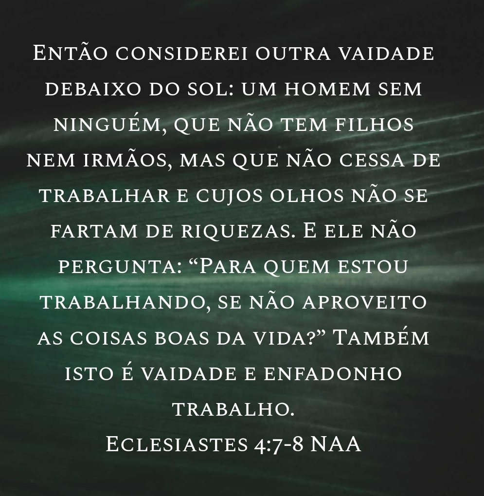 Então considerei outra vaidade debaixo do sol: um homem sem ninguém, que não tem filhos nem irmãos, mas que não cessa de trabalhar e cujos olhos não se fartam de riquezas. E ele não pergunta: “Para quem estou trabalhando, se não aproveito as coisas boas da vida?” Também isto é vaidade e enfadonho trabalho. Eclesiastes 4:7-8 NAA