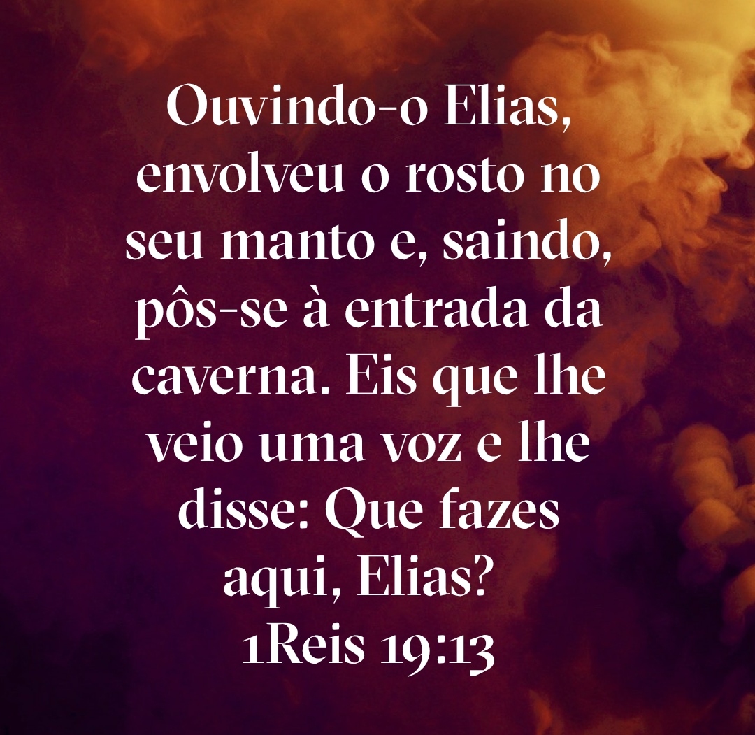 Ouvindo-o Elias, envolveu o rosto no seu manto e, saindo, pôs-se à entrada da caverna. Eis que lhe veio uma voz e lhe disse: Que fazes aqui, Elias?