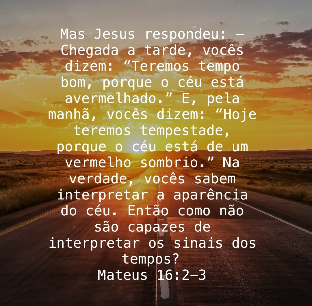 Mas Jesus respondeu: — Chegada a tarde, vocês dizem: “Teremos tempo bom, porque o céu está avermelhado.” E, pela manhã, vocês dizem: “Hoje teremos tempestade, porque o céu está de um vermelho sombrio.” Na verdade, vocês sabem interpretar a aparência do céu. Então como não são capazes de interpretar os sinais dos tempos?