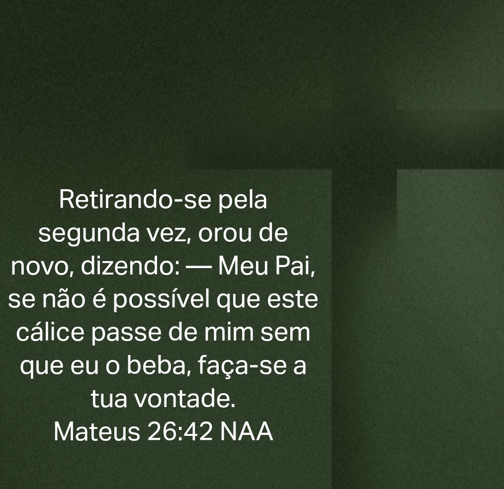 Retirando-se pela segunda vez, orou de novo, dizendo: — Meu Pai, se não é possível que este cálice passe de mim sem que eu o beba, faça-se a tua vontade. Mateus 26:42 NAA