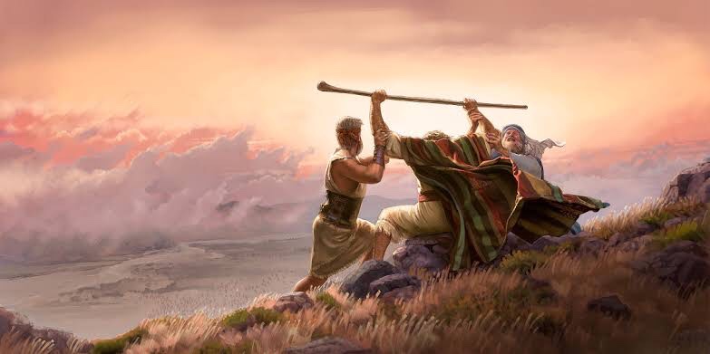 “Quando Moisés levantava a mão, Israel prevalecia; quando, porém, ele abaixava a mão, prevalecia Amaleque. Ora, as mãos de Moisés eram pesadas; por isso, tomaram uma pedra e a puseram por baixo dele, e ele nela se assentou; Arão e Hur sustentavam-lhe as mãos, um, de um lado, e o outro, do outro; assim lhe ficaram as mãos firmes até ao pôr do sol.”