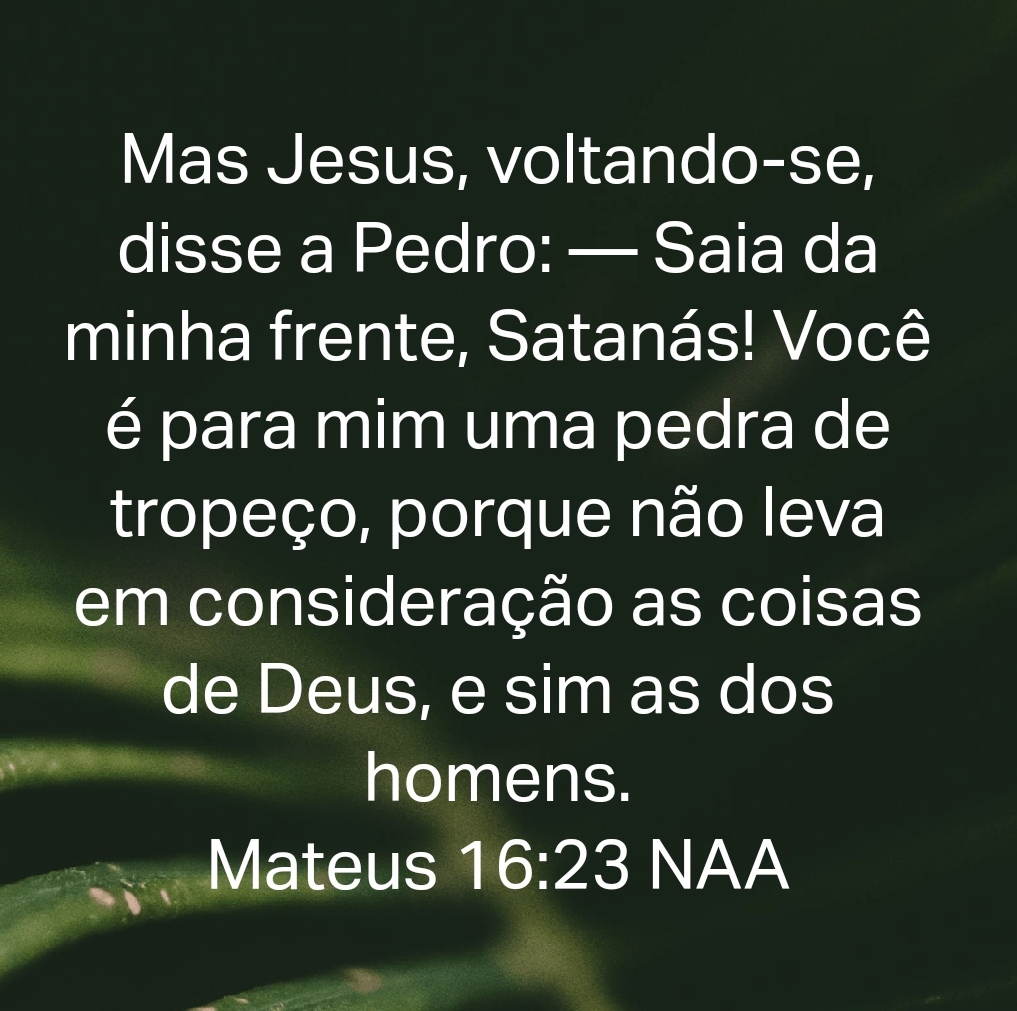Mas Jesus, voltando-se, disse a Pedro: — Saia da minha frente, Satanás! Você é para mim uma pedra de tropeço, porque não leva em consideração as coisas de Deus, e sim as dos homens. Mateus 16:23 NAA