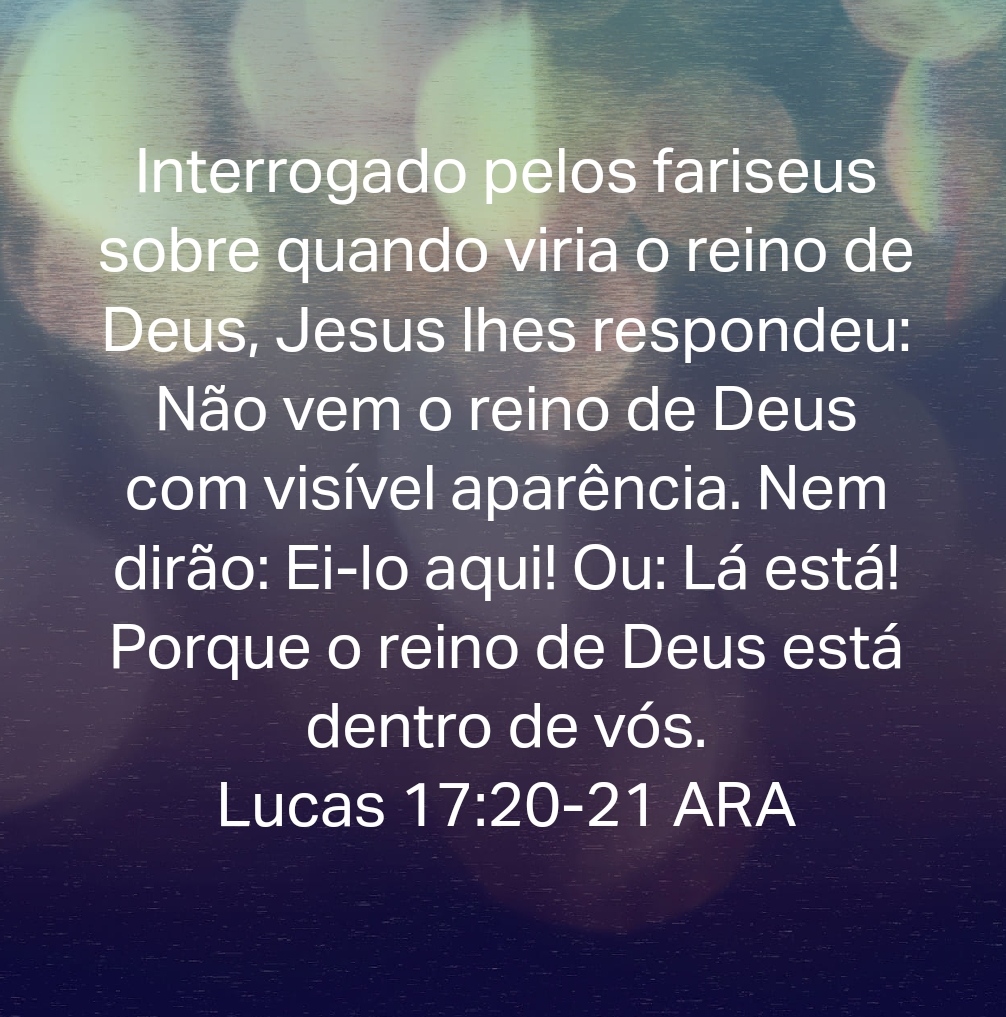 Interrogado pelos fariseus sobre quando viria o reino de Deus, Jesus lhes respondeu: Não vem o reino de Deus com visível aparência. Nem dirão: Ei-lo aqui! Ou: Lá está! Porque o reino de Deus está dentro de vós. Lucas 17:20-21 ARA