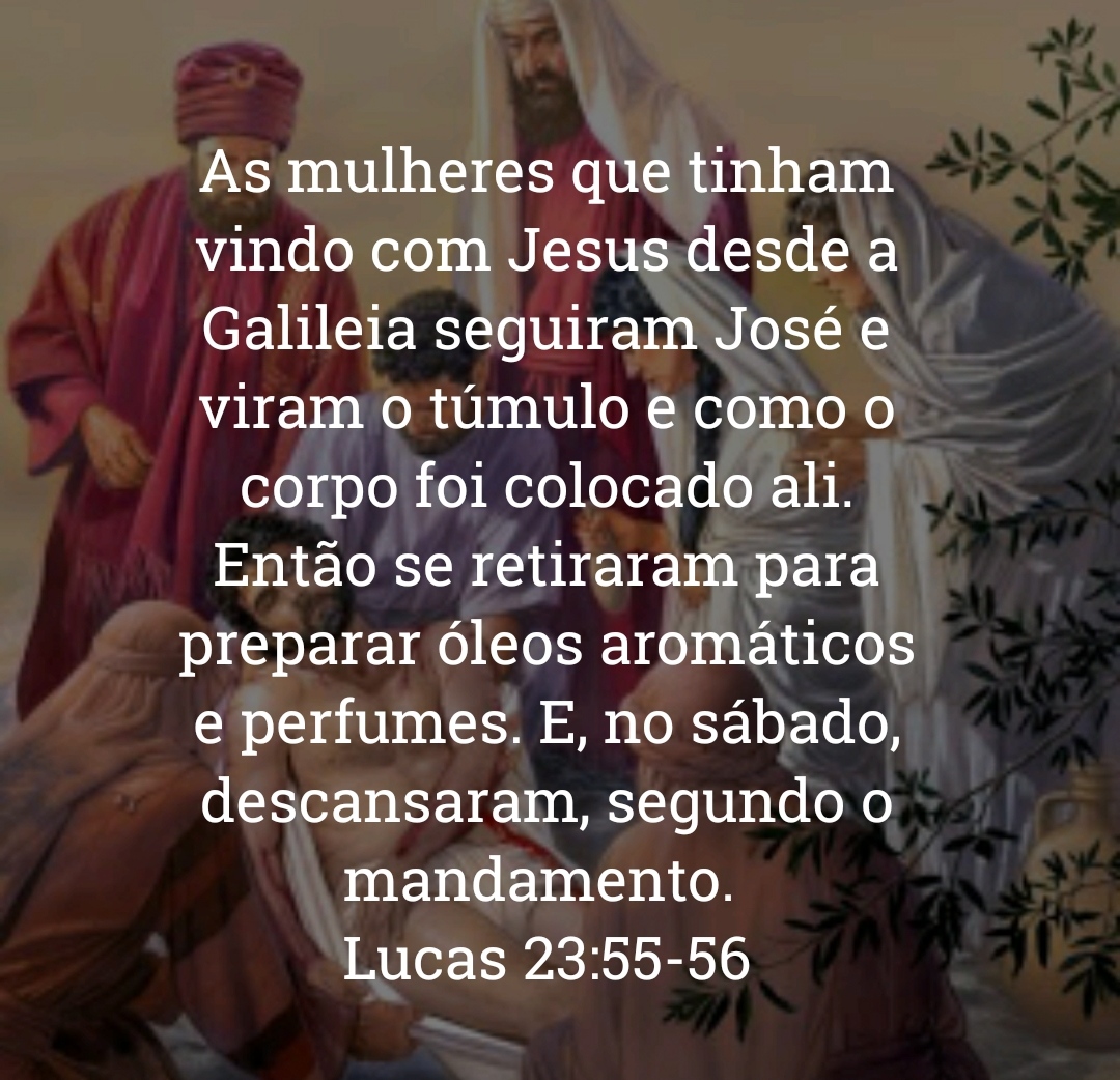 As mulheres que tinham vindo com Jesus desde a Galileia seguiram José e viram o túmulo e como o corpo foi colocado ali. Então se retiraram para preparar óleos aromáticos e perfumes. E, no sábado, descansaram, segundo o mandamento.