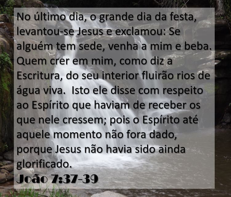 No último dia, o grande dia da festa, levantou-se Jesus e exclamou: Se alguém tem sede, venha a mim e beba.  Quem crer em mim, como diz a Escritura, do seu interior fluirão rios de água viva.  Isto ele disse com respeito ao Espírito que haviam de receber os que nele cressem; pois o Espírito até aquele momento não fora dado, porque Jesus não havia sido ainda glorificado.