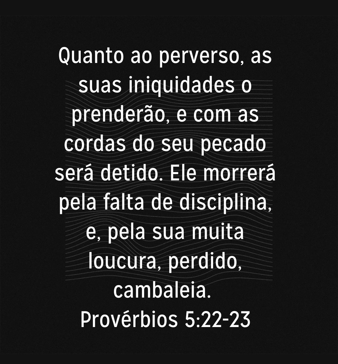 Quanto ao perverso, as suas iniquidades o prenderão, e com as cordas do seu pecado será detido. Ele morrerá pela falta de disciplina, e, pela sua muita loucura, perdido, cambaleia.