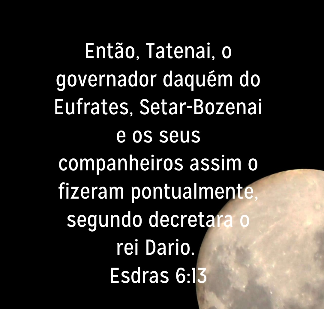 Então, Tatenai, o governador daquém do Eufrates, Setar-Bozenai e os seus companheiros assim o fizeram pontualmente, segundo decretara o rei Dario.