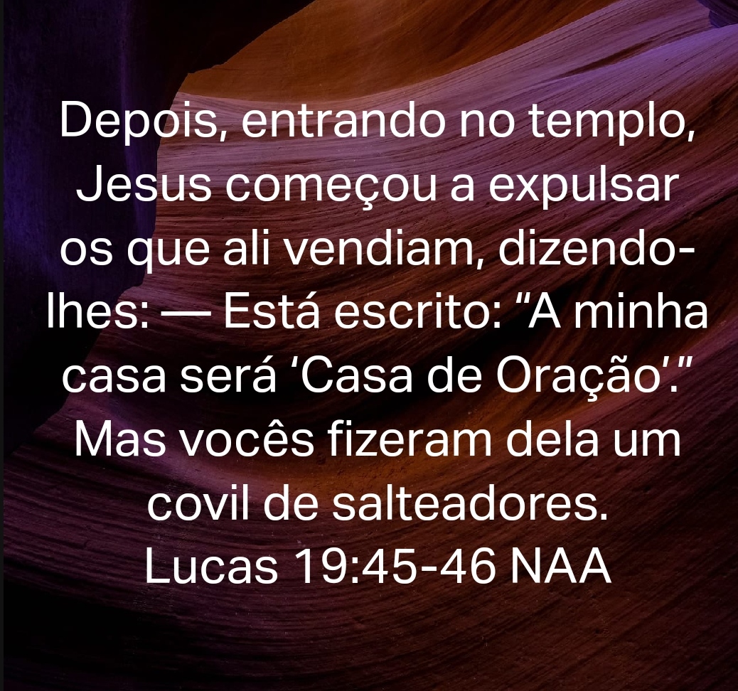 ‭‭Depois, entrando no templo, Jesus começou a expulsar os que ali vendiam, dizendo-lhes: — Está escrito: “A minha casa será ‘Casa de Oração’.” Mas vocês fizeram dela um covil de salteadores. Lucas‬ ‭19:45‭-‬46‬ ‭NAA‬‬
