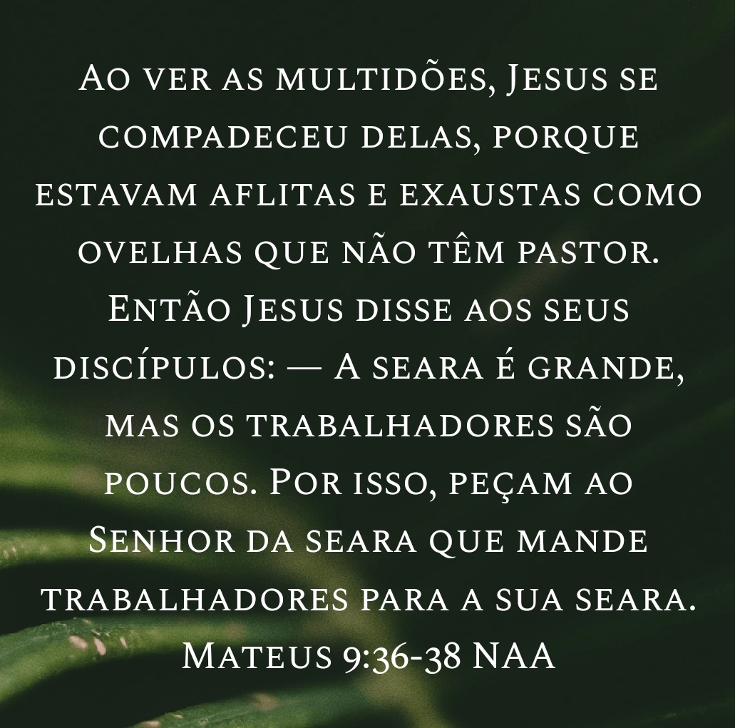‭‭Ao ver as multidões, Jesus se compadeceu delas, porque estavam aflitas e exaustas como ovelhas que não têm pastor. Então Jesus disse aos seus discípulos: — A seara é grande, mas os trabalhadores são poucos. Por isso, peçam ao Senhor da seara que mande trabalhadores para a sua seara. Mateus‬ ‭9:36‭-‬38‬ ‭NAA‬‬