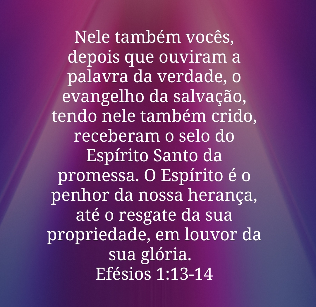 Nele também vocês, depois que ouviram a palavra da verdade, o evangelho da salvação, tendo nele também crido, receberam o selo do Espírito Santo da promessa. O Espírito é o penhor da nossa herança, até o resgate da sua propriedade, em louvor da sua glória.