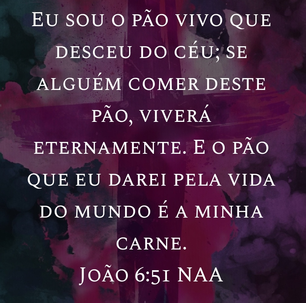 Eu sou o pão vivo que desceu do céu; se alguém comer deste pão, viverá eternamente. E o pão que eu darei pela vida do mundo é a minha carne. João 6:51 NAA
