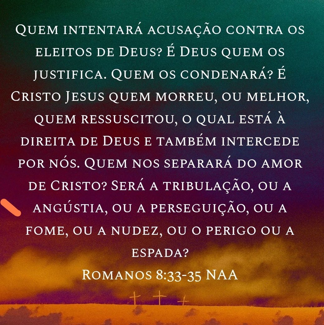 Quem intentará acusação contra os eleitos de Deus? É Deus quem os justifica. Quem os condenará? É Cristo Jesus quem morreu, ou melhor, quem ressuscitou, o qual está à direita de Deus e também intercede por nós. Quem nos separará do amor de Cristo? Será a tribulação, ou a angústia, ou a perseguição, ou a fome, ou a nudez, ou o perigo ou a espada? Romanos 8:33-35 NAA