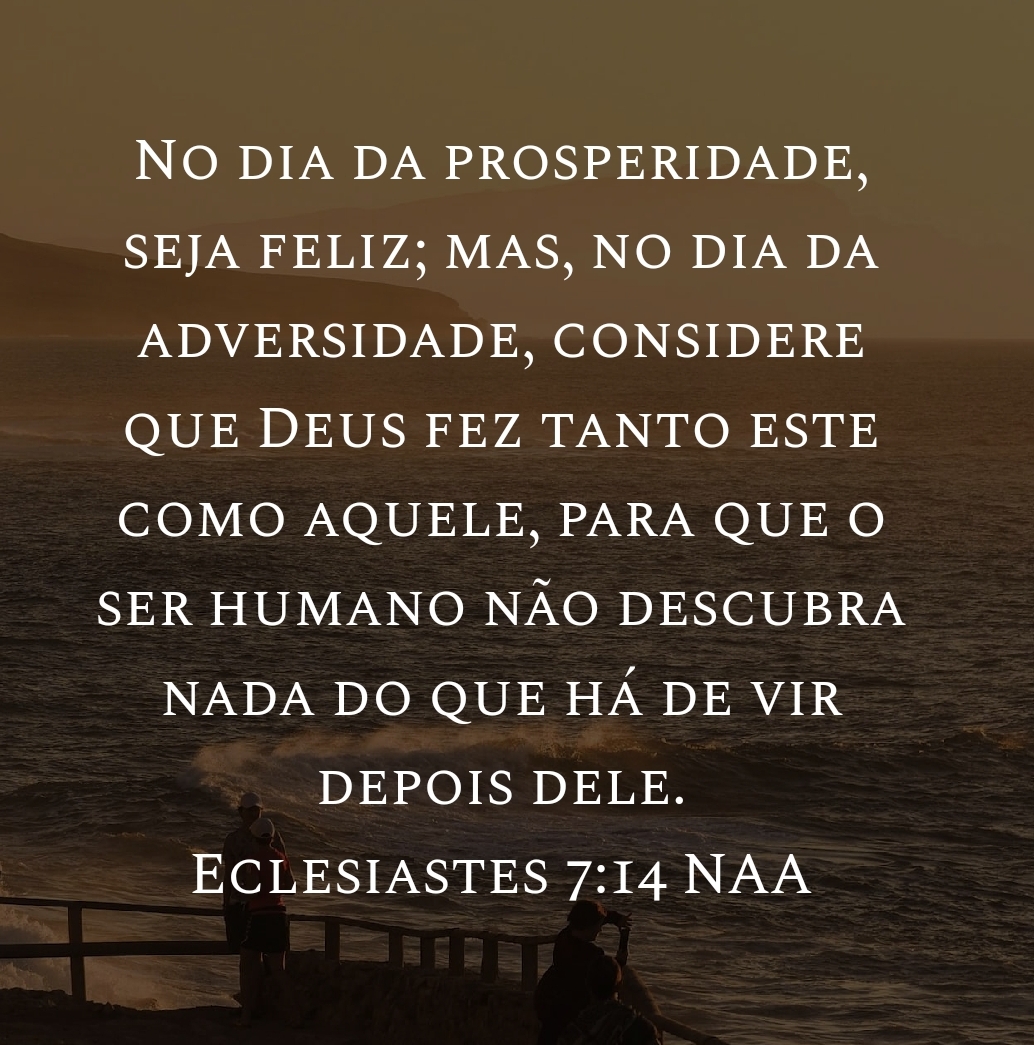 No dia da prosperidade, seja feliz; mas, no dia da adversidade, considere que Deus fez tanto este como aquele, para que o ser humano não descubra nada do que há de vir depois dele. Eclesiastes 7:14 NAA
