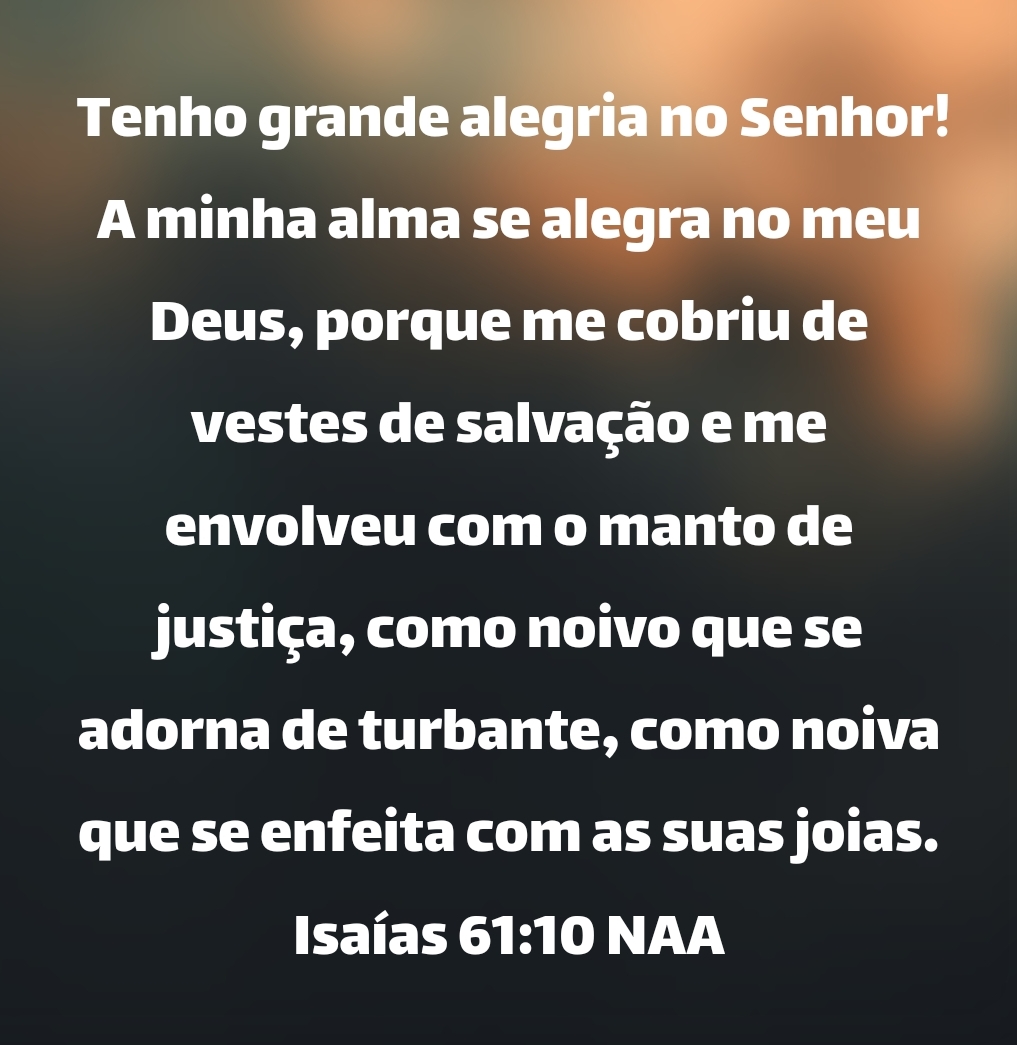 Tenho grande alegria no Senhor! A minha alma se alegra no meu Deus, porque me cobriu de vestes de salvação e me envolveu com o manto de justiça, como noivo que se adorna de turbante, como noiva que se enfeita com as suas joias. Isaías 61:10 NAA
