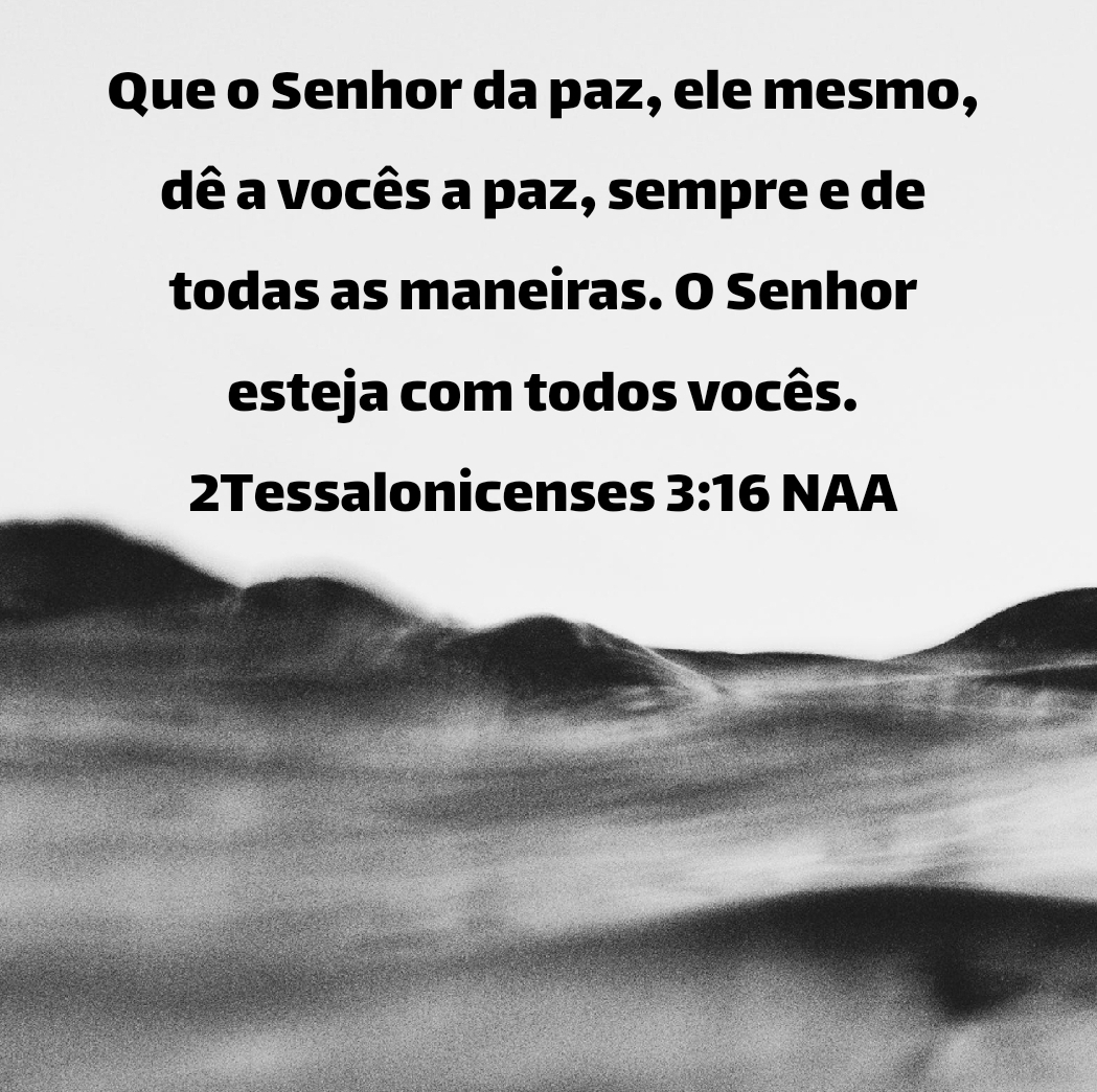 Que o Senhor da paz, ele mesmo, dê a vocês a paz, sempre e de todas as maneiras. O Senhor esteja com todos vocês. 2Tessalonicenses 3:16 NAA