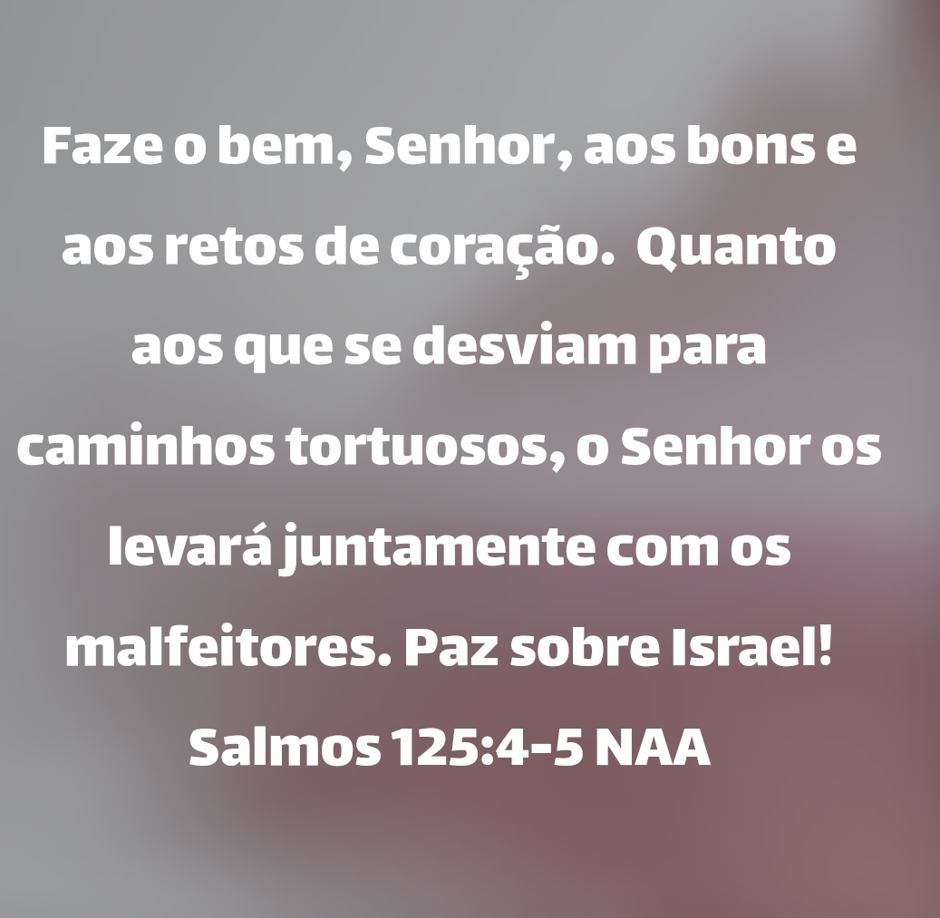 Faze o bem, Senhor, aos bons e aos retos de coração. Quanto aos que se desviam para caminhos tortuosos, o Senhor os levará juntamente com os malfeitores. Paz sobre Israel! Salmos 125:4-5 NAA