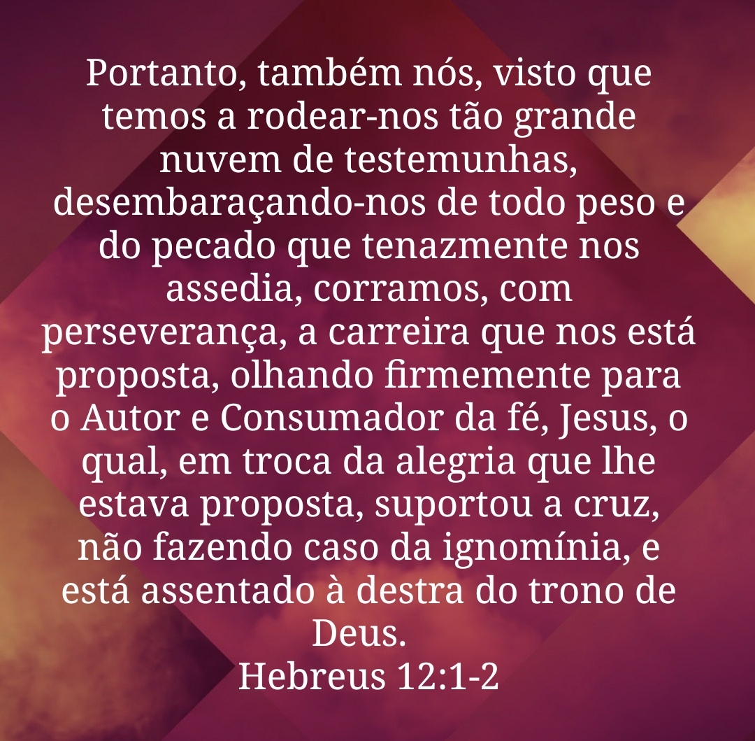 Portanto, também nós, visto que temos a rodear-nos tão grande nuvem de testemunhas, desembaraçando-nos de todo peso e do pecado que tenazmente nos assedia, corramos, com perseverança, a carreira que nos está proposta, olhando firmemente para o Autor e Consumador da fé, Jesus, o qual, em troca da alegria que lhe estava proposta, suportou a cruz, não fazendo caso da ignomínia, e está assentado à destra do trono de Deus.
