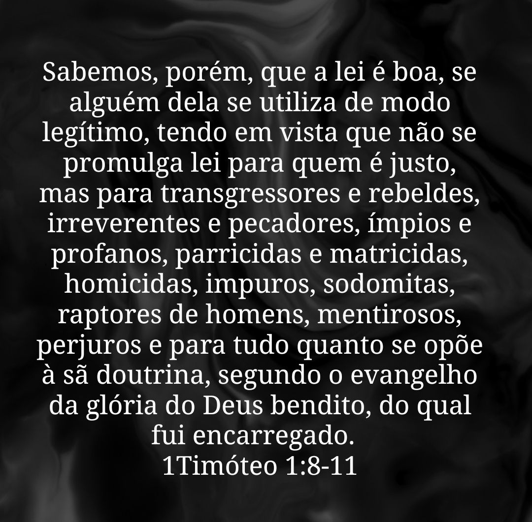Sabemos que a lei é boa, se alguém se utiliza dela de modo legítimo, tendo em vista que não se promulga lei para quem é justo, mas para os transgressores e rebeldes, para os ímpios e pecadores, para os iníquos e profanos, para os que matam o pai ou a mãe, para os homicidas, para os que praticam a imoralidade, para os que se entregam a práticas homossexuais, para os sequestradores, para os mentirosos, para os que fazem juramento falso e para tudo o que se opõe à sã doutrina, segundo o evangelho da glória do Deus bendito, do qual fui encarregado.