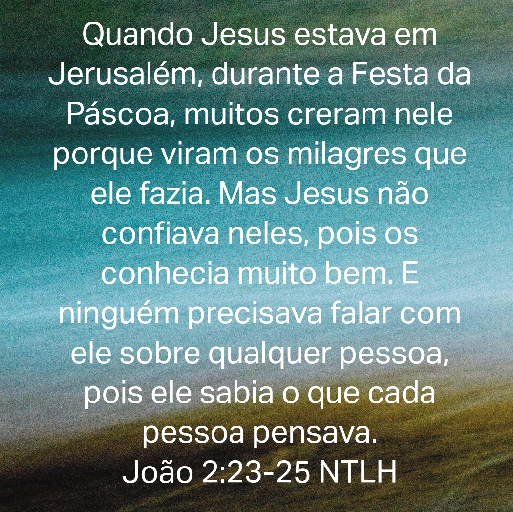 Quando Jesus estava em Jerusalém, durante a Festa da Páscoa, muitos creram nele porque viram os milagres que ele fazia. Mas Jesus não confiava neles, pois os conhecia muito bem. E ninguém precisava falar com ele sobre qualquer pessoa, pois ele sabia o que cada pessoa pensava. João 2:23-25 NTLH